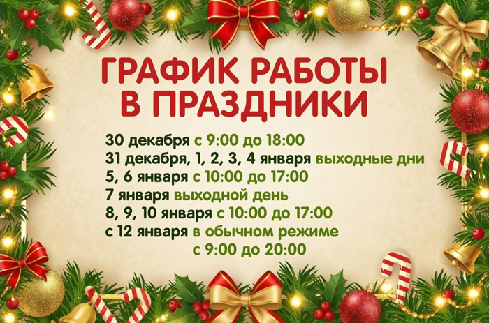 Уважаемые клиенты! Обращаем ваше внимание на изменения в режиме работы нашего магазина в период новогодних праздников.